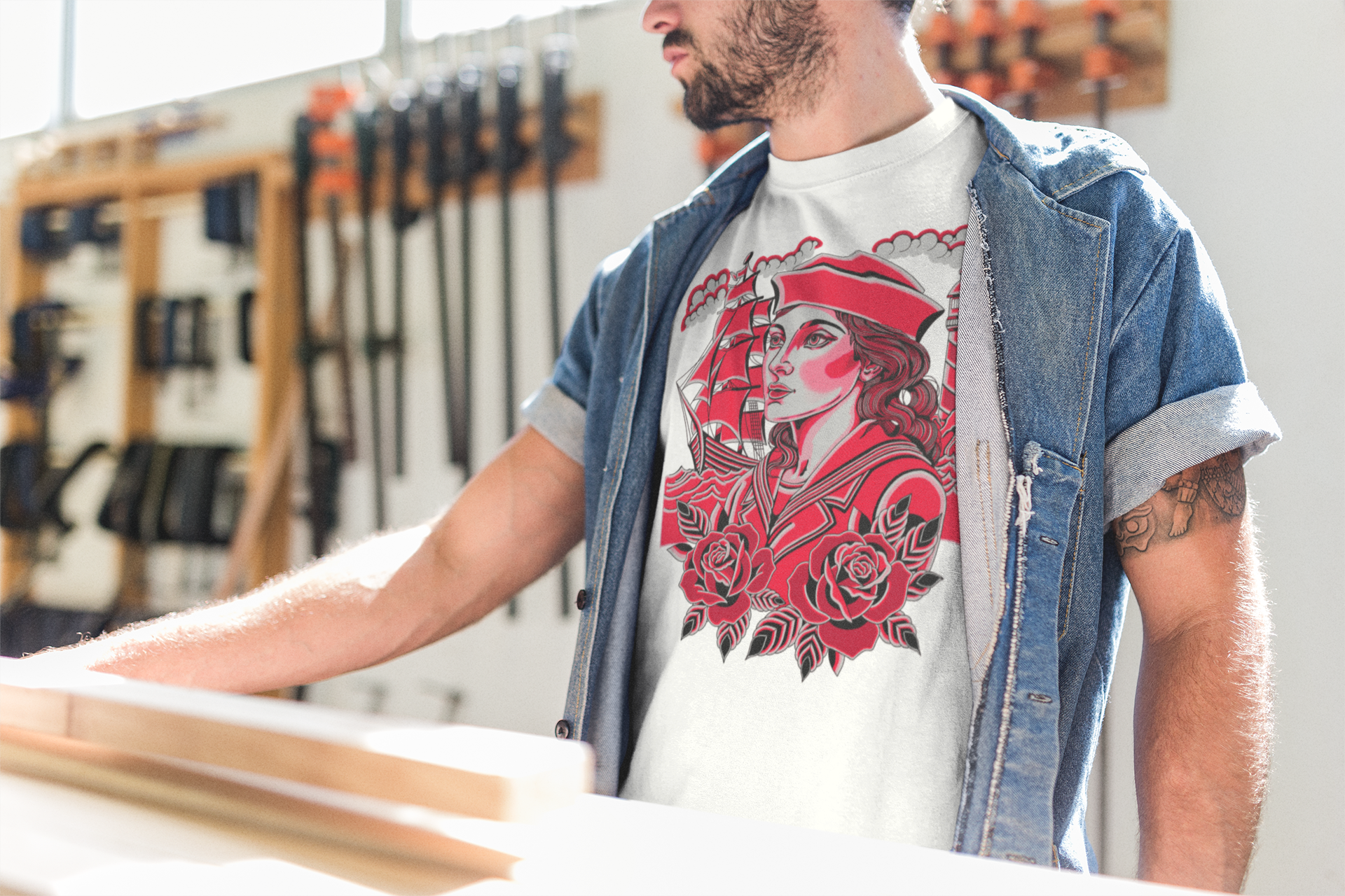 Printed in striking red and black, this nautical tattoo t-shirt is perfect for fans of sailor-inspired art, traditional tattoo culture, and unique graphic fashion. Original artwork by 21GRAMS.